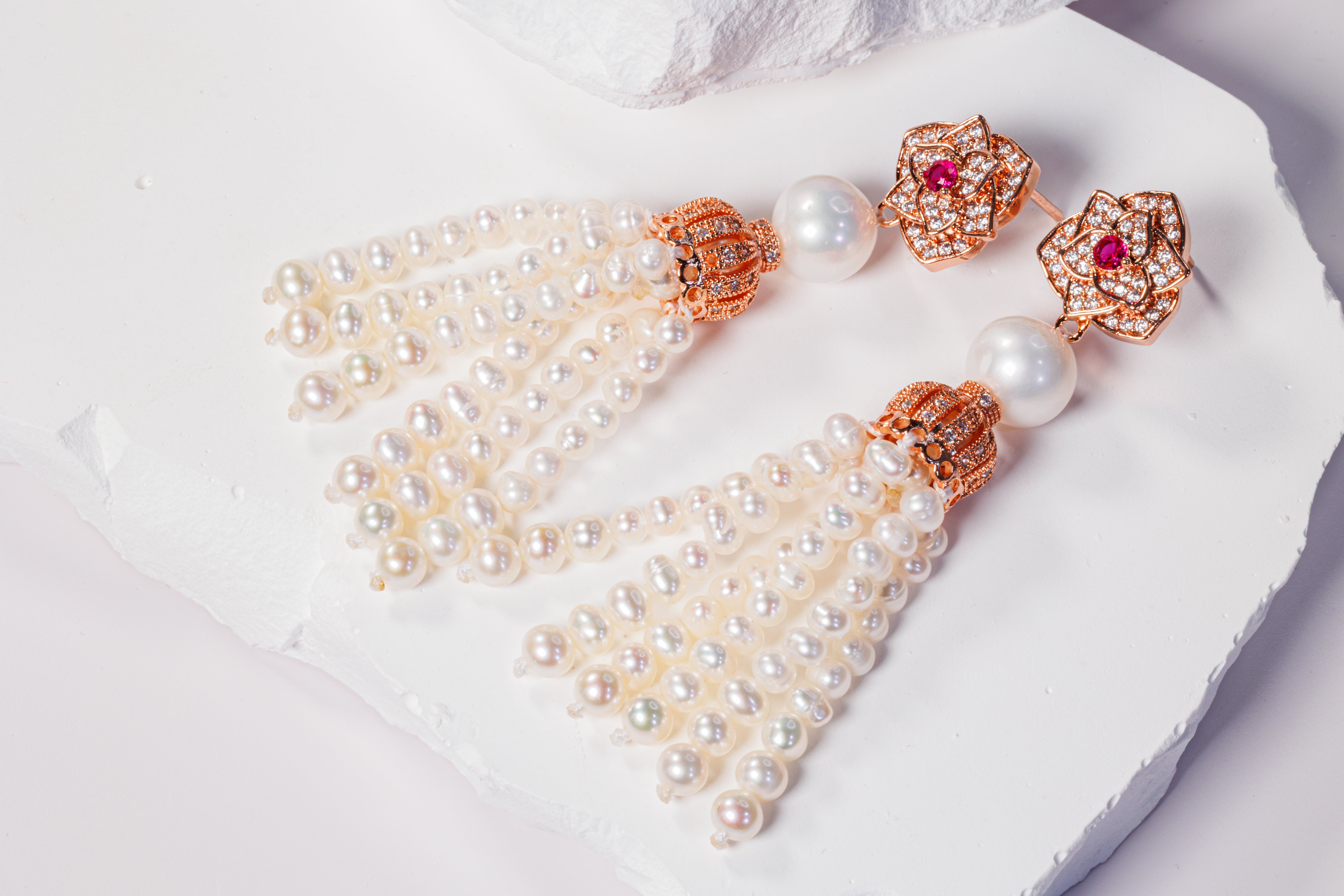 An ode to elegance and royalty, the Fancy Pink Zircon Crown Pearl Earrings bring together sculptural design, luminous pearls, and radiant sparkle. At the top, a floral crown motif encrusted with shimmering zircon stones frames a vivid pink zircon center, evoking the brilliance of fine high jewelry.