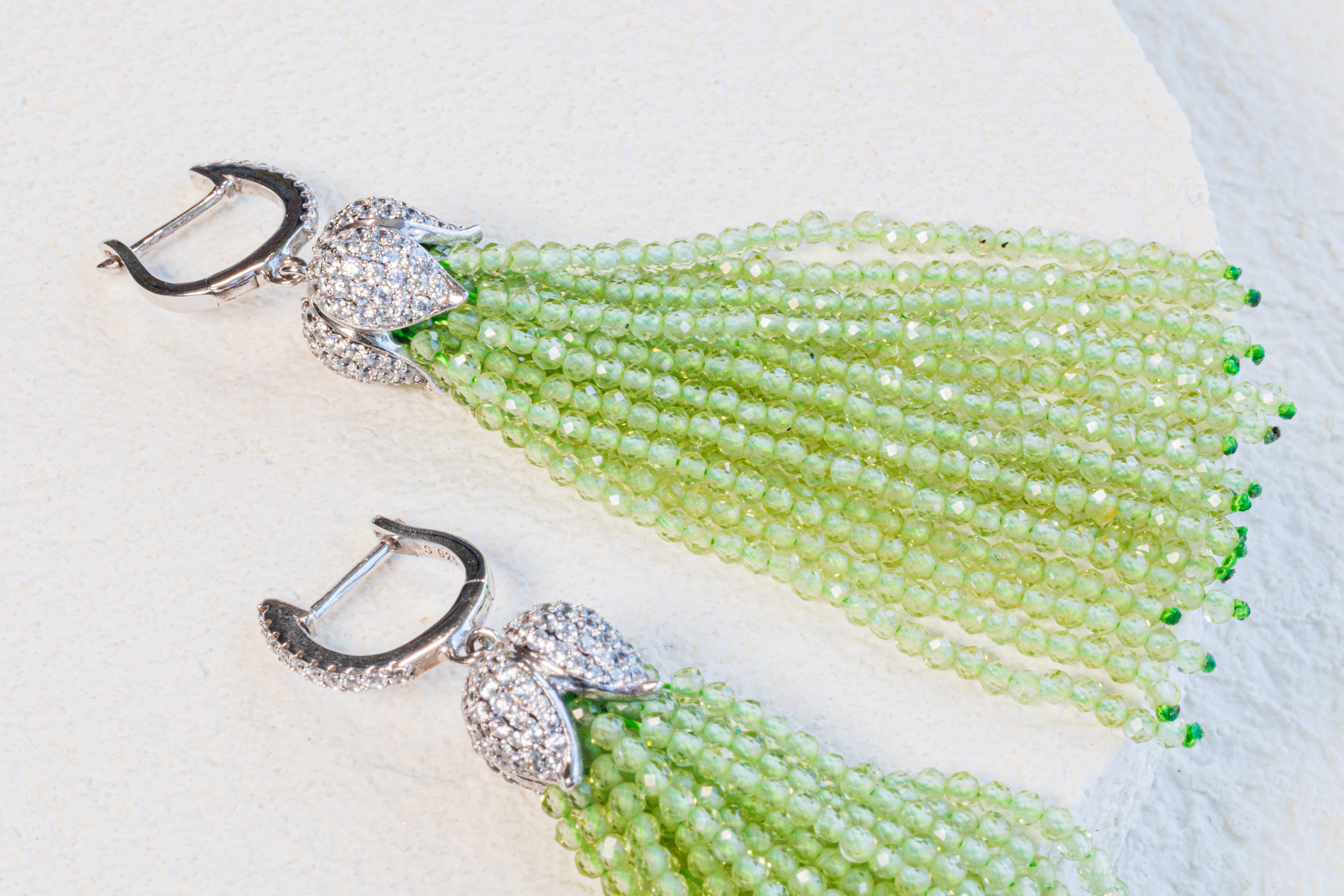 Vibrant and full of movement, these tassel earrings feature cascading strands of faceted peridot beads that shimmer with every turn. Suspended from polished white gold huggie-style tops, the design blends playful energy with refined elegance. Perfect for adding a pop of color and drama—whether paired with the matching necklace or worn as a bold standalone statement.